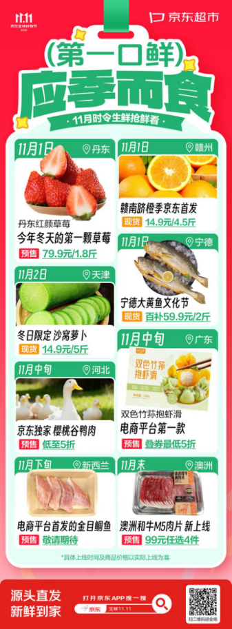 不仅如此,11.11期间,京东生鲜还为广大购买的人带来了“第一口鲜”。丹东红颜草莓、赣南脐橙、宁德大黄鱼等地理标志产品11月1日将在京东同步上线。此外,京东还将独家首发双色竹荪泡虾滑、樱桃谷鸭肉等创新产品,并在11月下旬引入新西兰金日鳕鱼、澳洲和牛M5肉片等进口美味,持续丰富消费者的秋冬餐桌。